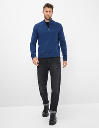 Der Lambswool-Pullover im Style Steffen verbindet modernen Anspruch mit funktionalem Komfort und präsentiert sich als idealer Begleiter für die kühle Jahreszeit. Die markante Troyer-Form mit sportivem Reißverschluss und hohem Kragen bietet angenehme Wärme und verleiht dem Pullover einen klaren, maskulinen Charakter. Die feine Mouliné-Optik bringt optische Tiefe und eine lebendige Melierung in das Design – ein subtiler Effekt, der den gepflegten, modernen Look zusätzlich unterstreicht. Der hochwertige Lambswool-Mix fühlt sich weich an, ist atmungsaktiv und überzeugt durch natürliche Wärme sowie zuverlässige Formstabilität. Als Knitted Jersey verarbeitet, zeigt sich der Pullover in einer besonders soften und dennoch robusten Strickqualität, die sowohl im Alltag als auch im Office eine gute Figur macht.