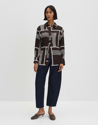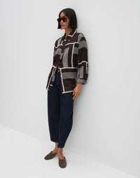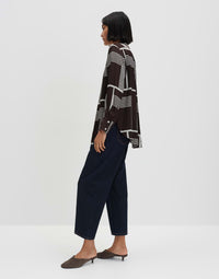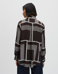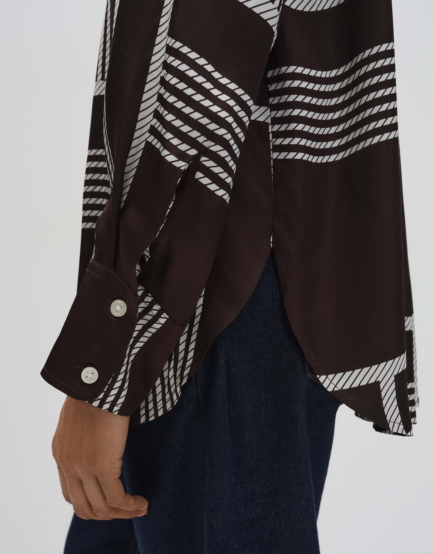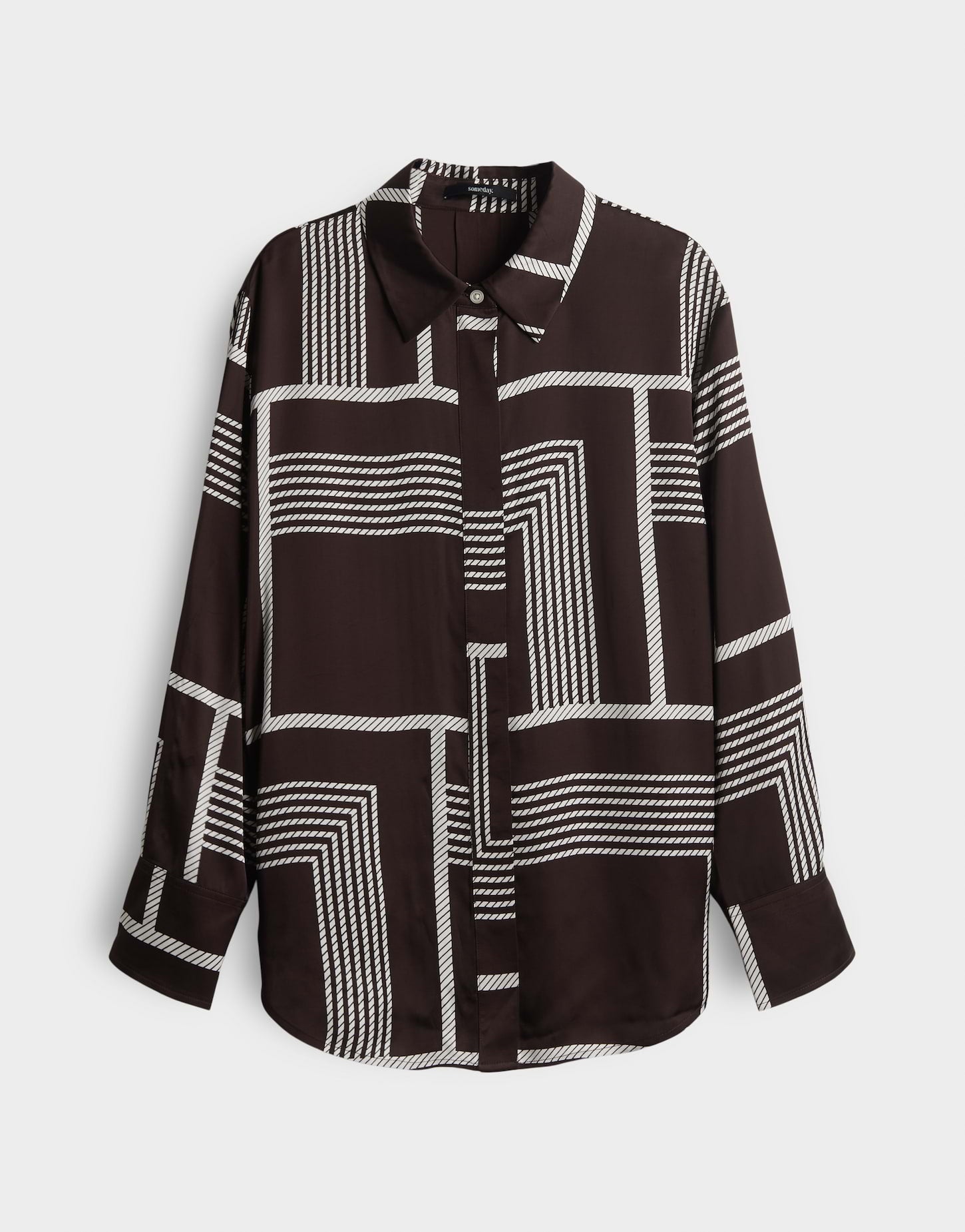 Sanft schimmernde Satinbluse mit grafischem Streifenprint, aus dem sich ein abstraktes Karomuster bildet. Ob modern gestylt zur Barrel Leg Jeans oder zur passenden, weich fließenden Printhose, sie setzt immer ein modisches Statement.